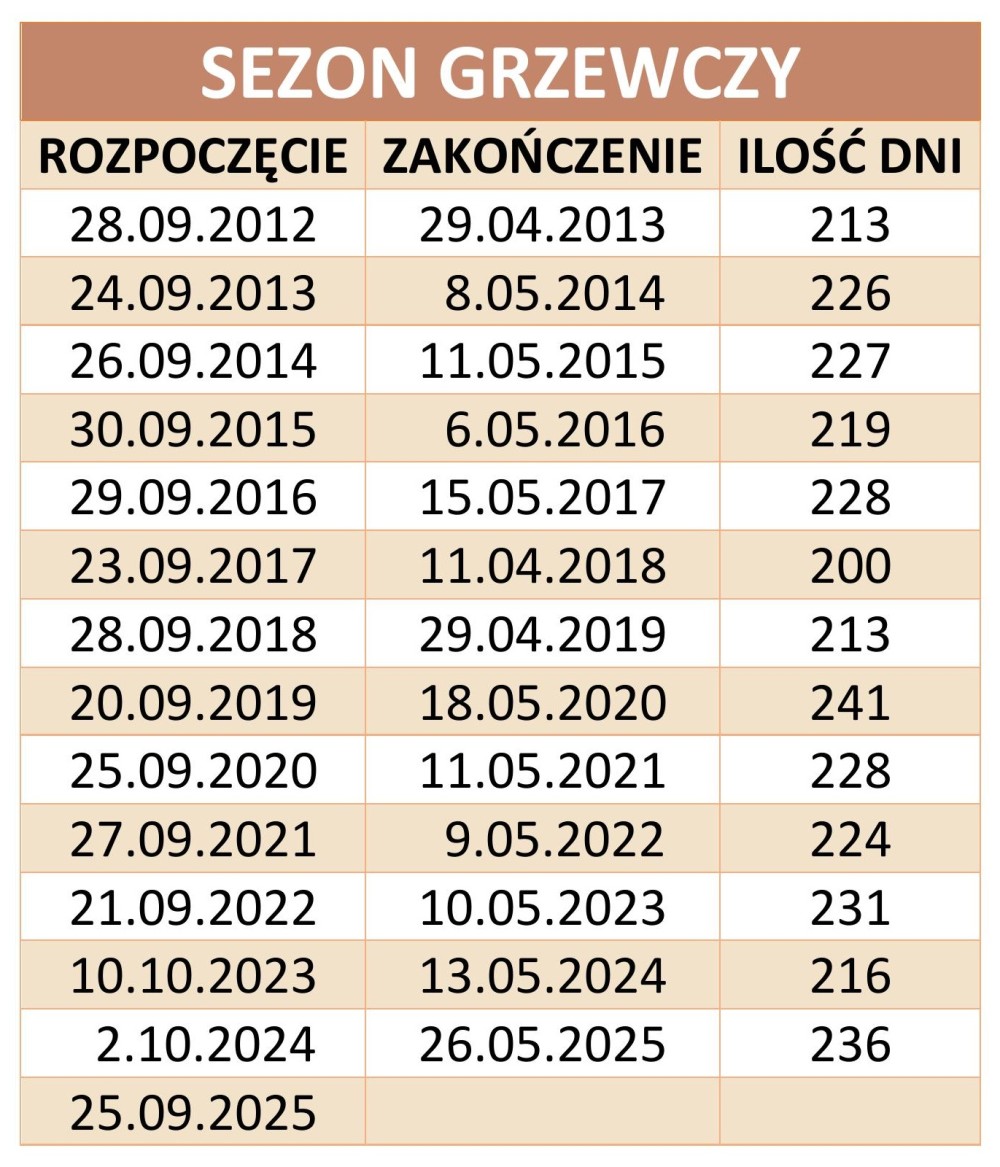 Rozpoczęcia, zakończenia i czas trwania sezonów grzewczych w latach: