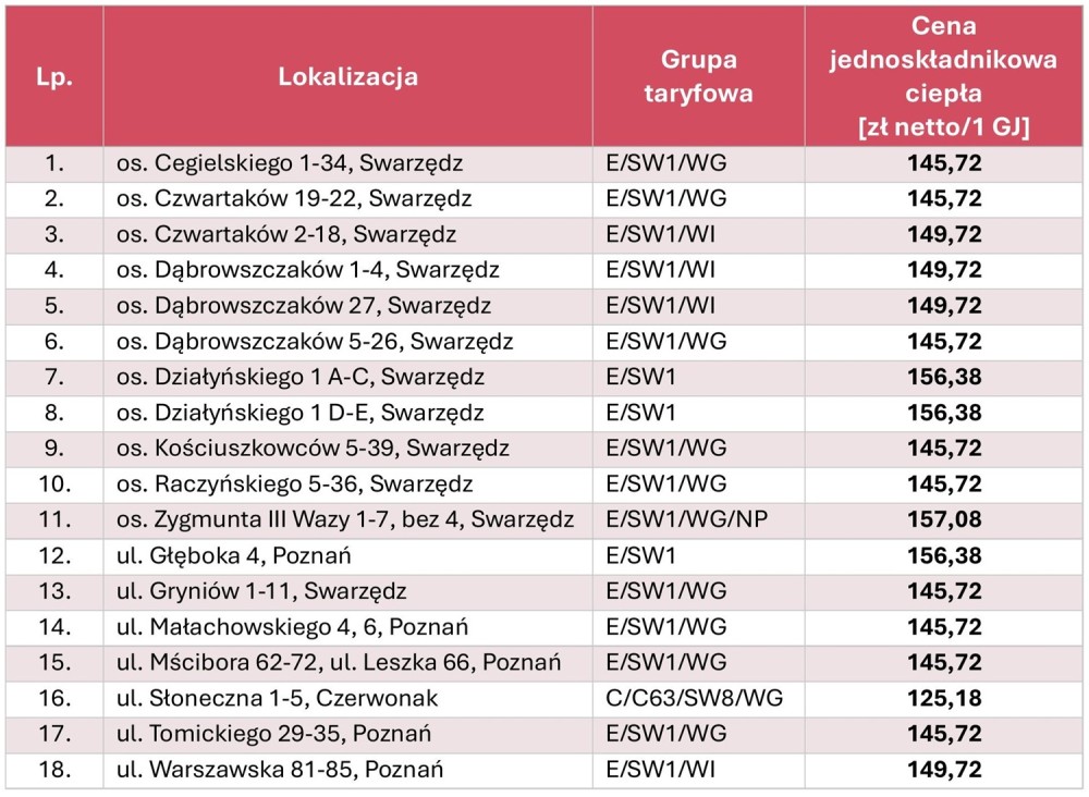 W naszej Spółdzielni Mieszkaniowej ceny jednoskładnikowe, dostarczanego przez firmę Veolia Energia Poznań ciepła, są niższe niż 170 zł netto za 1 GJ – wahają się od 125,18 zł do 157,08 zł w zależności od lokalizacji i grupy taryfowej (patrz tabela niżej).