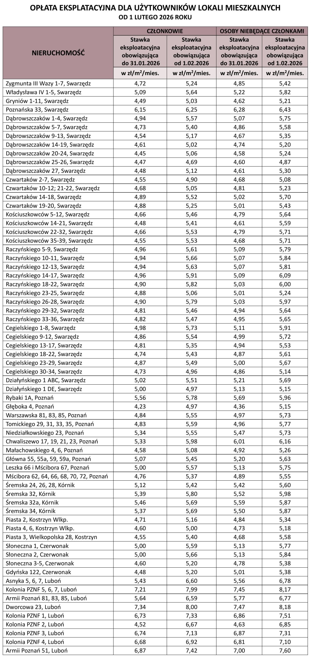 - ul. Mścibora 62, 64, 66, 68, 70, 72, Poznań – 0,16 zł/m2/mies.