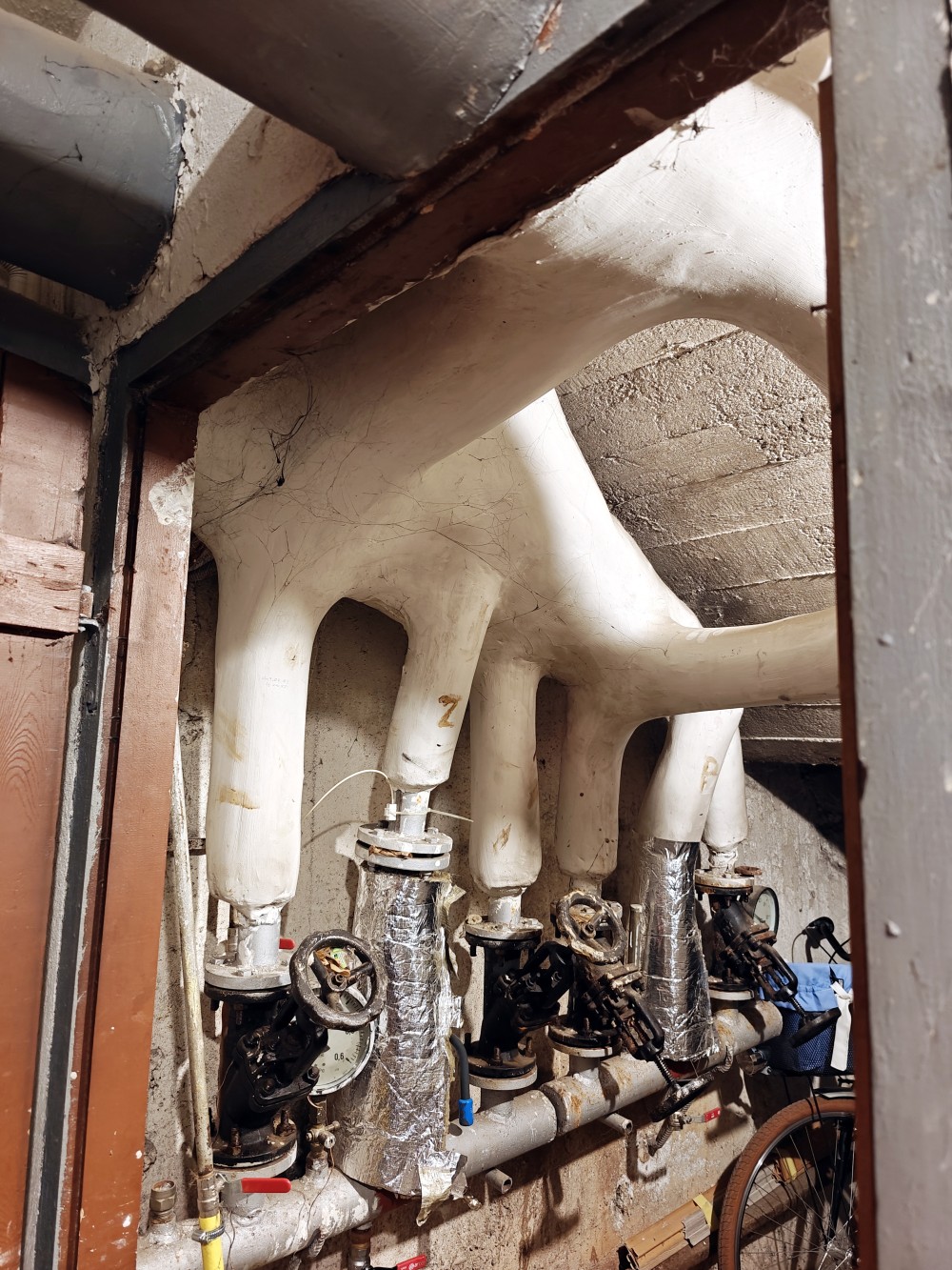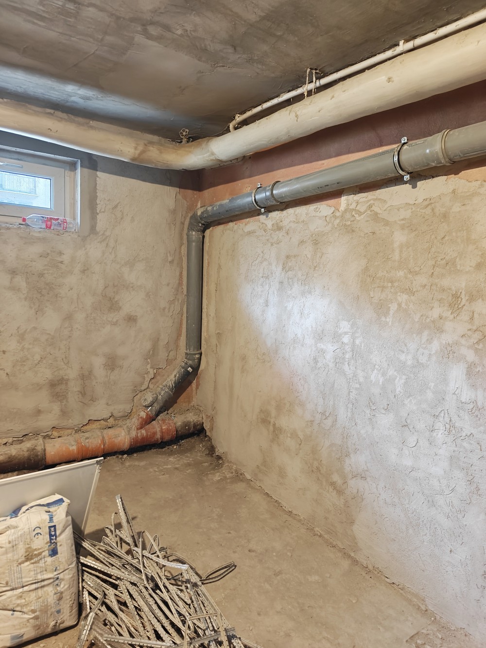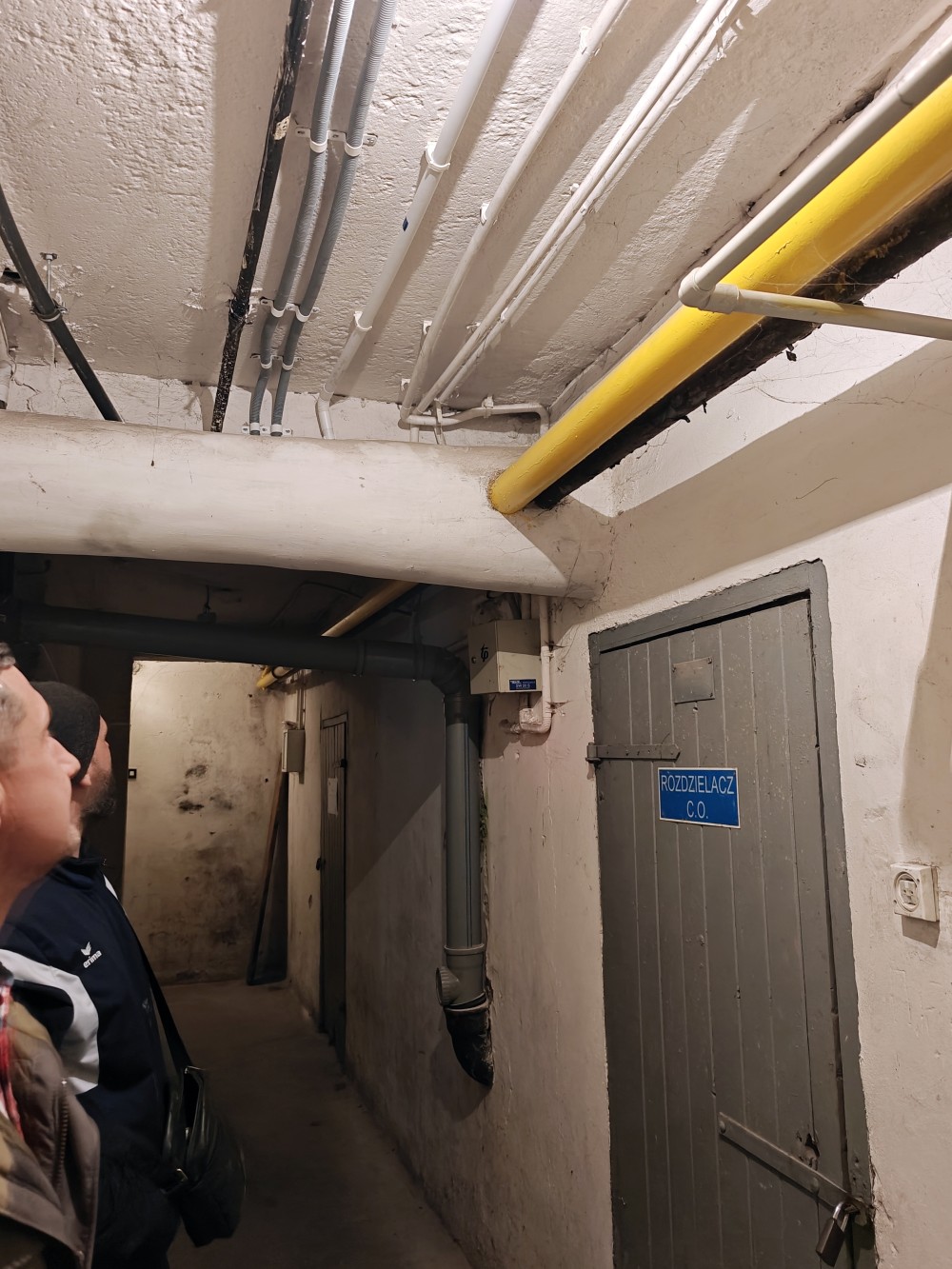 Podsufitowe instalacje w piwnicy oraz rozdzielnia centralnego ogrzewania: